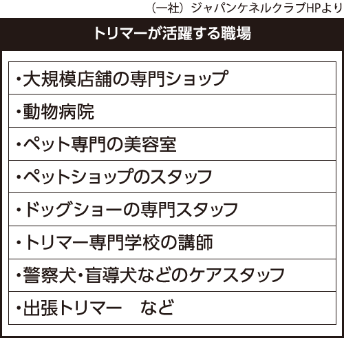 トリマーの資格にはJKC(ジャパンケネルクラブ)公認資格や、サロントリマー検定(全国動物専門学校協会)、トリマーペットスタイリスト(日本能力開発推進協会)など複数あります。飼い主からあらゆる相談を受けることが多いため、トリマーは美容の知識と技術だけではなく、犬以外に猫などのペット動物の健康、飼養管理に必要な知識まで、幅広く持っておく必要があります。ペットの高齢化が進み、様々なニーズが生まれていることから、活躍のチャンスは広がっています。