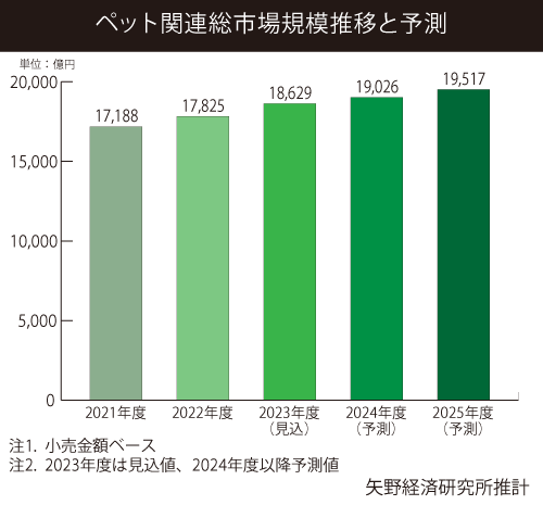 2024年は犬の飼育頭数が、679万6千頭に対して猫の飼育頭数は915万5千頭で、前年に引き続き猫が犬の数を上回りました。ペットの高齢化に向け、ペットフードの多様化に始まり、医療、保険、また体のお手入れや健康促進に配慮した産業、ペットエステやドッグヨガ、さらにペットと泊まれる宿泊施設やペットの最期を演出する葬祭業など、製品・サービス市場が拡大傾向です。