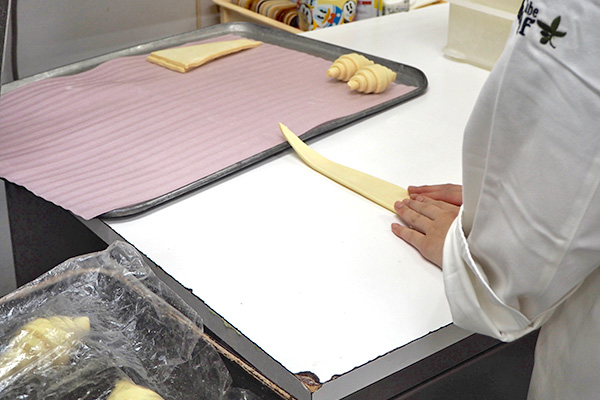 現在は、工場で製造担当として主にクロワッサンやデニッシュなどの折り込みパンを作っています。お休みの日は同期と気になっているパン屋さんに行って食べ比べをするのですが、折り込みパンの担当になってからはその系統のパンが目に付くことが多くなったと感じます。パン製造は一日として同じ日がないため難しい作業です。粉の状態や気温、湿度、触る人によっても生地感が変わってしまうため毎回触って確認したうえで判断します。綺麗に成形できても、焼いた後に上手くいかないこともありました。また、時間に追われながら段取りも考えなければいけないため、慣れるまでは大変でした。スピードも大事ですが、雑に作られたパンはお客様にも喜んでもらえないため、丁寧さも重視しています。難しいけどやりがいがあり、勉強になることが多く、常に成長を感じられます。以前、店長の技術を見せていただいたときに、あっという間に綺麗に成形されるパンを見て、まるで魔法の手のようだと感動しました。いつか私も、店長のようにパンを作りたいと思いました。
