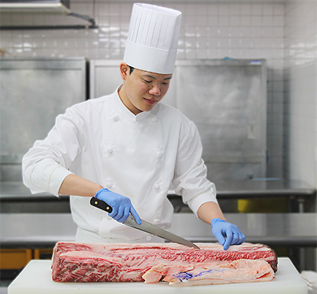 かわた ゆうすけ▶群馬調理師専門学校を卒業。専門学校では包丁の技術からソースの仕込みなど料理の基礎を学び、腕を磨く。卒業後は株式会社帝国ホテルに入社。メインダイニングのレ セゾンで2年間勤務したのち、センターキッチン課のブッチャーに配属。帝国ホテル 東京でお客様に提供される肉料理全般の仕入れ・仕込みを担う。
