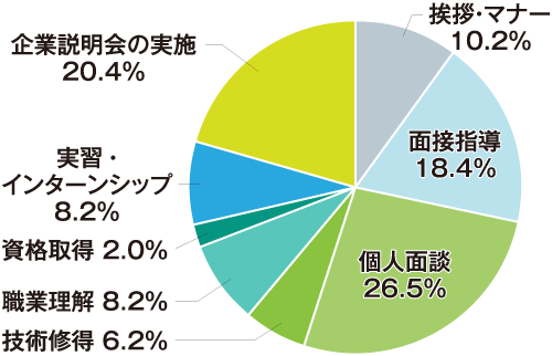 就職指導においては、例年通り面談や面接の指導、企業説明会に力を入れている学校が多いようです。それ以外では、「カリキュラムに就職支援の授業を取り入れている」(専門学校日本デザイナー学院 九州校)のように、就職支援を意識したカリキュラムを用意している学校がいくつか見受けられました。